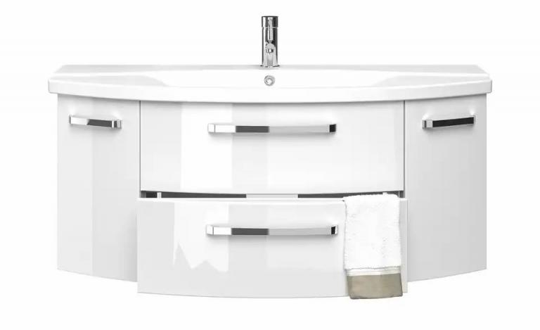 Gesamtbreite: 120,5 cm Gesamthöhe: 53,7 cm Gesamttiefe: 48 cm Merkmale Stilrichtung: Zeitlos Mehr zu Ausführung: hängend Anzahl Türen: 2 Stück Anzahl Schubkästen: 2 Stück Türanschlag: links rechts Türart: Drehtüren Ausstattung Bestehend aus: Waschtischunterschrank Keramikwaschtisch Mehr zu Ausstattung / Funktion: Türdämpfer Schubkastendämpfer Lieferumfang Lieferumfang / mitgeliefertes Zubehör: Keramik-Waschtisch Waschtischunterschrank nicht im Lieferumfang enthalten: Armatur Spiegelschrank Beimöbel Hinweise Montagehinweise: Wandbefestigung erforderlich Reinigungsart & Pflegehinweise: Oberfläche mit feuchtem Baumwolltuch abwischen und mit trockenem Tuch nachwischen Material & Farbe Farbe / Dekor Korpus innen: Weiß Farbe / Dekor Griffe: silberfarben glänzend Farbe / Dekor Front: Hochglanz Weiß Material sichtbare Rückwand: Holzwerkstoff beschichtet Material Korpus: Holzwerkstoff beschichtet Material Front: Holzwerkstoff beschichtet Material Griffe: Metall Farbe / Dekor Korpus: Weiß Farbe / Dekor: Weiß Mehr zu Material: Waschtisch aus Keramik Mehr zu Farbe: Waschtisch in Weiß Artikelnummer: 11063367 Lieferung ohne Dekoration
