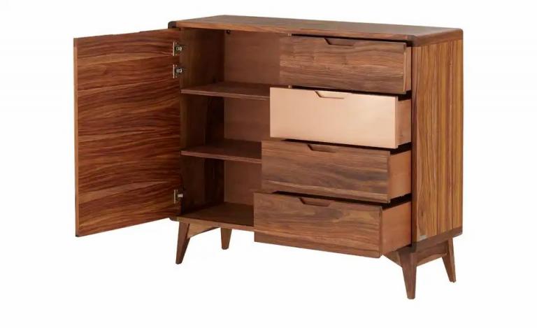 Holz zum Schutz lackiert Extravagante Holzmaserung Viel Stauraum im Inneren Maße Gesamtbreite: 130 cm Gesamthöhe: 112 cm Gesamttiefe: 42 cm Merkmale Stilrichtung: Ethno Griffart: Griffmulde Mehr zu Ausführung: Einfräsungen für Griffmulden abgerundete Ecken Ausführung: Absetzung aus Kupfer Anzahl Türen: 1 Stück Anzahl Böden: 2 Stück Anzahl Schubkästen: 4 Stück Türanschlag: links Türart: Drehtüren Ausstattung Gestell: Füße Ausstattung / Funktion: Türdämpfer Schubkastendämpfer Material & Farbe Farbe / Dekor Korpus innen: Sheesham Farbe / Dekor Griffe: Sheesham Farbe / Dekor Front: Sheesham Kupferfarben Material Korpus: Holzwerkstoff furniert Material Front: Holzwerkstoff furniert Metall Material Griffe: Holzwerkstoff furniert Material Füße / Gestell: Massivholz Farbe / Dekor Füße/Gestell: Sheesham Farbe / Dekor Korpus: Sheesham Farbe / Dekor: Sheesham Kupferfarben Mehr zu Material: Front und Korpus Sheesham furniert, Lackbeschichtung Natur / 1 Schubkastenfront mit Kupfer handbeschlagen, lackiert Artikelnummer: 13232242 Lieferung ohne Dekoration