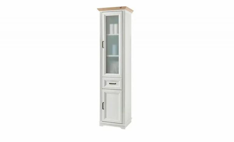 Attraktiver Landhausstil Tür und Schubfach in Kassettenoptik Absetzung in authentischer Asteichen-Nachbildung Praktischer Stauraum für Badzubehör Passend zur Badmöbeln der gleichnamigen Serie Maße Gesamtbreite: 48 cm Gesamthöhe: 190 cm Gesamttiefe: 43 cm Merkmale Stilrichtung: Landhaus Griffart: Bügelgriff Türen mit Glaseinsatz: 1 Stück Mehr zu Ausführung: Stehend Anzahl Türen: 2 Stück Anzahl Böden: 3 Stück Anzahl Schubkästen: 1 Stück Türanschlag: wechselbar Türart: Drehtüren Ausstattung Gestell: Sockel Hinweise Reinigungsart & Pflegehinweise: Oberfläche mit feuchtem Baumwolltuch abwischen und mit trockenem Tuch nachwischen Material & Farbe Farbe / Dekor Korpus innen: Pinie (Nachbildung) Farbe / Dekor Einlegeböden: Pinie (Nachbildung) Farbe / Dekor Griffe: antik Farbe / Dekor Front: matt Pinie (Nachbildung) Material Korpus: Holzwerkstoff foliert Material Front: Glas Material Einlegeböden: Holzwerkstoff foliert Material Griffe: Metall Material Füße / Gestell: Holzwerkstoff foliert Farbe / Dekor Füße/Gestell: Pinie (Nachbildung) Farbe / Dekor Korpus: Pinie (Nachbildung) Farbe / Dekor: Pinie (Nachbildung) Eiche (Nachbildung) Asteiche (Nachbildung) Mehr zu Material: Glas satiniert Artikelnummer: 11065387 Lieferung ohne Dekoration
