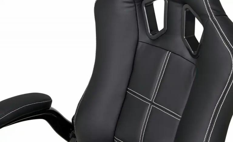 Sitzhöhe: 58,5 cm Gesamtbreite: 75 cm Gesamthöhe: 120 cm Gesamttiefe: 70 cm Sitztiefe: 50,5 cm Mehr zu Maßen: Durchmesser Rollen 5,0 cm Merkmale Stilrichtung: Modern Ausstattung Ausstattung / Funktion: Sitz stufenlos höhenverstellbar Wippmechanik Armlehne Drehfunktion Art der Polsterung: Schaumstoff Gestell: 5er Kreuzgestell Rollen Ausführung Rollen: Teppichbodenrollen Polster-Unterkonstruktion: Spanplatte Technische Daten max. Belastbarkeit bis ca.: 110 kg Hinweise entspricht DIN: DIN EN 12520 – Stuhl erfüllt die Anforderungen (Festigkeit, Dauerhaltbarkeit, Sicherheit) an Sitzmöbel für den Wohnbereich. Reinigungsart & Pflegehinweise: Oberfläche mit feuchtem Baumwolltuch abwischen und mit trockenem Tuch nachwischen Material & Farbe Bezug Sitz / Rückenlehne: Kunstleder Material Füße / Gestell: Kunststoff Materialzusammensetzung Textil: 100% Polyurethan Farbe / Dekor Füße/Gestell: Schwarz glänzend Farbe / Dekor: Schwarz Weiß Material Sitz / Rückenlehne: Holzwerkstoff gepolstert und bezogen Mehr zu Material: Armlehnen-Polster mit Kunstleder bezogen (100% Polyurethan) Artikelnummer: 11352022 Lieferung ohne Dekoration