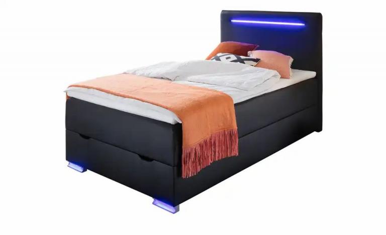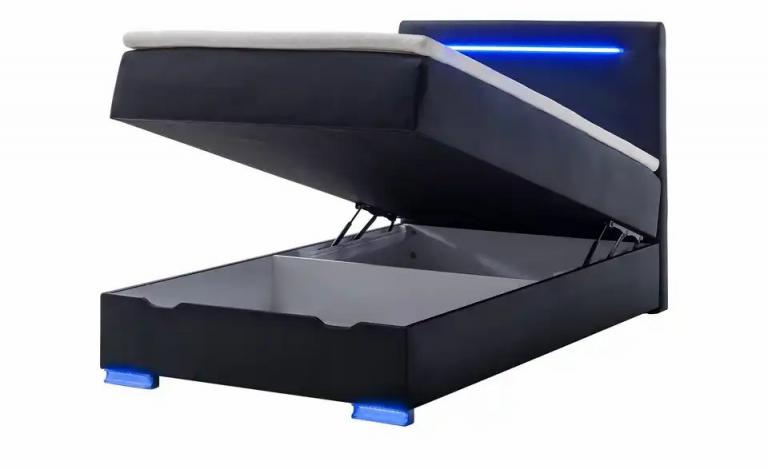 Kopfteil und Füße mit LED-Beleuchtung in Blau USB-Anschluss Inklusive Geräumige Bettkästen für zusätzlichen Stauraum Maße Gesamtbreite: 143 cm Gesamtlänge: 208,5 cm Gesamthöhe: 110 cm Liegefläche Breite: 140 cm Liegefläche (B x L): 140×200 cm Mehr zu Maßen: Tiefe Kopfteil 8,5 cm Höhe Box: 25 cm Höhe Matratze: 25 cm Höhe Topper: 4 cm Liegehöhe: 60 cm Liegefläche Länge: 200 cm Höhe Füße: 6 cm Merkmale Stilrichtung: Modern Mehr zu Ausführung: Kopfteil und Füße mit LED-Beleuchtung Ausführung: Kopfteil mit Beleuchtung Härtegrad der Matratze(n): H2 Anzahl Matratzen: 1 Stück Ausstattung Leuchtmittelart: LED Anzahl Matratzenkerne: 1 Stück Beleuchtungszubehör: Kopfteil mit Beleuchtung Ausstattung / Funktion: Beleuchtung innen liegender Bettkasten Bettkastenöffnung am Fußteil mit Gasdruckfeder Lichtfarbe: Blau Mehr zu Ausstattung / Funktion: Kopfteil und Metallfüße mit LED- Beleuchtung Bonnellboxspring und Bonnellfederkernmatratze in einem Bezug, Höhe ca. 28 cm Bettkasten frontal klappbar Bettkastenhöhe ca. 25 cm mit USB-Anschluss Technische Daten Austauschbarkeit der Lichtquelle: Bei diesem Produkt ist das Austauschen der Lichtquelle möglich. max. Belastbarkeit pro Liegefläche bis ca.: 120 kg Lieferumfang Lieferumfang / mitgeliefertes Zubehör: inkl. Beleuchtung Hinweise Sicherheitshinweise: Belastbarkeit pro Liegefläche: ca. 120 kg Reinigungsart & Pflegehinweise: Oberfläche mit feuchtem Baumwolltuch abwischen und mit trockenem Tuch nachwischen Oberflächen nur mit geeignetem Aufsatz absaugen Flüssigkeiten und Fett möglichst sofort abwischen stärkere Verschmutzungen mit milder Seife und lauwarmem Wasser behandeln Material & Farbe Material Gestell: Holzwerkstoff gepolstert und bezogen Matratzenkern: Bonnellfederkern Material Matratzenbezug: Kunstleder Flachgewebe Kern der Box: Bonnellfederkern Material Bezug: Kunstleder Topperkern: Schaumstoffkern Material Topper-Bezug: Mikrofaser Materialzusammensetzung Textil: 100% Polyurethan Topper: 100% Polyester Matratzenspiegel: 100% Polyester Farbe / Dekor: Schwarz Material Füße: Kunststoff Mehr zu Material: Kopfteil Holzwerkstoff gepolstert und bezogen Mehr zu Farbe: Farbe Füße: silberfarben Artikelnummer: 13129975 Lieferung ohne Dekoration