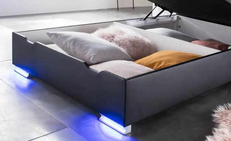 Kopfteil und Füße mit LED-Beleuchtung in Blau USB-Anschluss Inklusive Geräumige Bettkästen für zusätzlichen Stauraum Maße Gesamtbreite: 123 cm Gesamtlänge: 208,5 cm Gesamthöhe: 110 cm Liegefläche Breite: 120 cm Liegefläche (B x L): 120×200 cm Mehr zu Maßen: Tiefe Kopfteil 8,5 cm Höhe Box: 25 cm Höhe Matratze: 25 cm Höhe Topper: 4 cm Liegehöhe: 60 cm Liegefläche Länge: 200 cm Höhe Füße: 6 cm Merkmale Stilrichtung: Modern Mehr zu Ausführung: Kopfteil und Füße mit LED-Beleuchtung Ausführung: Kopfteil mit Beleuchtung Härtegrad der Matratze(n): H2 Anzahl Matratzen: 1 Stück Ausstattung Leuchtmittelart: LED Anzahl Matratzenkerne: 1 Stück Beleuchtungszubehör: Kopfteil mit Beleuchtung Ausstattung / Funktion: Beleuchtung innen liegender Bettkasten Bettkastenöffnung am Fußteil mit Gasdruckfeder Lichtfarbe: Blau Mehr zu Ausstattung / Funktion: Bonnellboxspring und Bonnellfederkernmatratze in einem Bezug; Höhe ca. 28 cm Kopfteil und Metallfüße mit LED- Beleuchtung mit USB-Anschluss Bettkastenhöhe ca. 25 cm Bettkasten frontal klappbar Technische Daten Austauschbarkeit der Lichtquelle: Bei diesem Produkt ist das Austauschen der Lichtquelle möglich. max. Belastbarkeit pro Liegefläche bis ca.: 120 kg Lieferumfang Lieferumfang / mitgeliefertes Zubehör: inkl. Beleuchtung Hinweise Sicherheitshinweise: Belastbarkeit pro Liegefläche: ca. 120 kg Montagehinweise: Bitte berücksichtigen: Da es sich um ein sperriges Möbelstück handelt, ist auf ausreichend Platz bei der Lieferung bis in die Wohnung zu achten. Reinigungsart & Pflegehinweise: Flüssigkeiten und Fett möglichst sofort abwischen Oberfläche mit feuchtem Baumwolltuch abwischen und mit trockenem Tuch nachwischen stärkere Verschmutzungen mit milder Seife und lauwarmem Wasser behandeln Oberflächen nur mit geeignetem Aufsatz absaugen Material & Farbe Material Gestell: Holzwerkstoff gepolstert und bezogen Matratzenkern: Bonnellfederkern Material Matratzenbezug: Kunstleder Flachgewebe Kern der Box: Bonnellfederkern Material Bezug: Kunstleder Topperkern: Schaumstoffkern Material Topper-Bezug: Mikrofaser Materialzusammensetzung Textil: 100% Polyurethan Topper: 100% Polyester Matratzenspiegel: 100% Polyester Farbe / Dekor: Schwarz Material Füße: Kunststoff Mehr zu Material: Kopfteil Holzwerkstoff gepolstert und bezogen Mehr zu Farbe: Farbe Füße: silberfarben Artikelnummer: 13122070 Lieferung ohne Dekoration