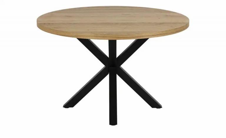 In Wildeiche-Optik Gestell aus stabilem Metall Bodenschutz durch Plastik Fußkappen Maße Gesamtbreite: 120 cm Gesamtlänge: 120 cm Gesamthöhe: 76,4 cm Maße Tisch (LxB): Ø120×76,4 cm Höhe Tischunterkante: 72,4 cm Stärke Tischplatte: 4 cm Merkmale Stilrichtung: Modern Industrial Form: rund Ausführung Tischkante: gerade Tischkante Platz für ca.: 4 Personen Ausstattung Gestell: Kreuzgestell Hinweise Reinigungsart & Pflegehinweise: Flüssigkeiten und Fett möglichst sofort abwischen Reinigung mit feuchtem, nicht tropfnassem Tuch Material & Farbe Farbe / Dekor Gestell: Schwarz Material Tischplatte: Holzwerkstoff furniert Material Gestell: Metall pulverbeschichtet Farbe / Dekor: Wildeiche (Nachbildung) Artikelnummer: 40307010 Lieferung ohne Dekoration