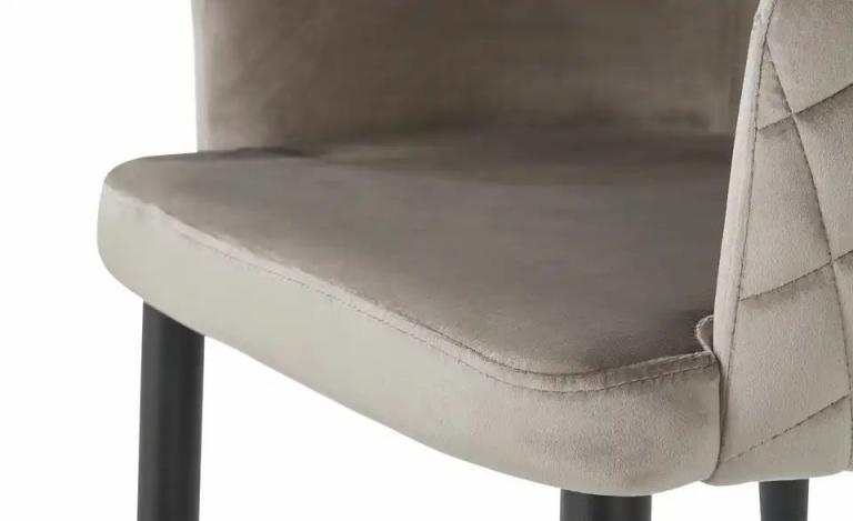 Samtig weicher Stoffbezug Dekorative Diamant-Steppung Mattschwarze Metallfüße Maße Sitzhöhe: 49 cm Gesamtbreite: 59 cm Gesamthöhe: 84 cm Gesamttiefe: 63 cm Höhe Rückenlehne: 39 cm Sitztiefe: 45 cm Höhe Armlehne (vorne): 67,5 cm Merkmale Stilrichtung: Glamour Modern Ausführung: Außenseite mit Diamant-Steppung Ausstattung Ausstattung / Funktion: Armlehne Art der Polsterung: Schaumstoff Gestell: 4-Fußgestell Polster-Unterkonstruktion: Holzwerkstoff Technische Daten max. Belastbarkeit bis ca.: 110 kg Hinweise entspricht DIN: DIN EN 12520 – Stuhl erfüllt die Anforderungen (Festigkeit, Dauerhaltbarkeit, Sicherheit) an Sitzmöbel für den Wohnbereich. Reinigungsart & Pflegehinweise: stärkere Verschmutzungen mit milder Seife und lauwarmem Wasser behandeln Material & Farbe Bezug Sitz / Rückenlehne: Samt Material Füße / Gestell: Metall Materialzusammensetzung Textil: 100% Polyester Farbe / Dekor Füße/Gestell: Schwarz pulverbeschichtet matt Farbe / Dekor: Grau Material Sitz / Rückenlehne: Holzwerkstoff gepolstert und bezogen Artikelnummer: 15302652 Lieferung ohne Dekoration
