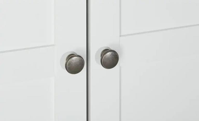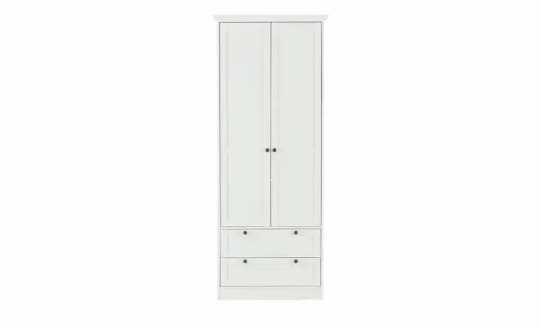Großzügiger Stauraum Pflegeleichte Oberflächen Landhausstil in Weiß Maße Gesamtbreite: 80 cm Gesamthöhe: 200 cm Gesamttiefe: 51 cm Merkmale Stilrichtung: Landhaus Griffart: Möbelknopf Anzahl Türen: 2 Stück Anzahl Böden: 2 Stück Anzahl verstellbare Einlegeböden: 1 Stück Anzahl Schubkästen: 2 Stück Türanschlag: links rechts Türart: Drehtüren Anzahl Kleiderstangen: 1 Stück Ausstattung Gestell: Sockel Lieferumfang nicht im Lieferumfang enthalten: Holzleim Hinweise Reinigungsart & Pflegehinweise: Oberfläche mit feuchtem Baumwolltuch abwischen und mit trockenem Tuch nachwischen Material & Farbe Farbe / Dekor Korpus innen: Weiß Farbe / Dekor Einlegeböden: Weiß Farbe / Dekor Griffe: antik Farbe / Dekor Front: Weiß Farbe / Dekor Kleiderstange: Weiß Material Korpus: Holzwerkstoff foliert Material Front: Holzwerkstoff foliert Material Einlegeböden: Holzwerkstoff foliert Material Griffe: Metall Farbe / Dekor Füße/Gestell: Weiß Farbe / Dekor Korpus: Weiß Farbe / Dekor: Weiß Mehr zu Material: Material Kleiderstange: Metall, silberfarben Artikelnummer: 11133256 Lieferung ohne Dekoration