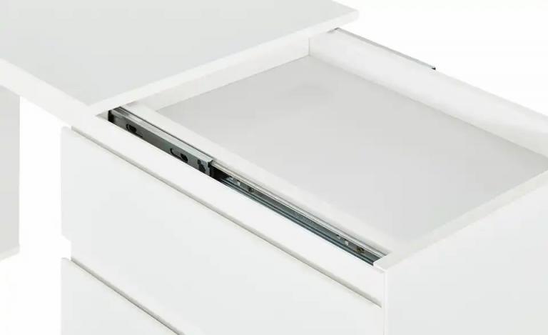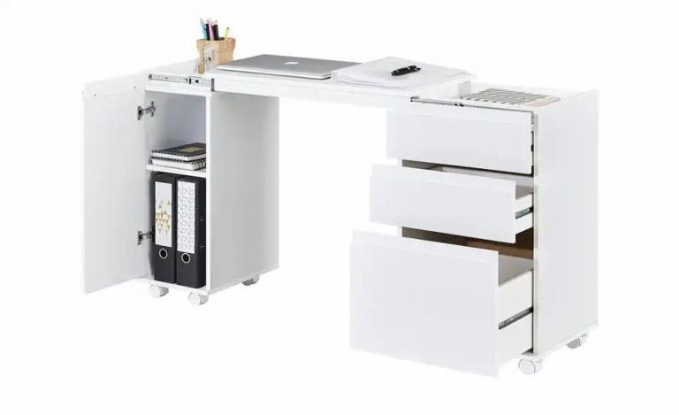 Bei Bedarf kinderleicht ausziehbar Durch Rollen leicht beweglich Zwei Container mit viel Stauraum Praktische Schreibtischplatte Moderner Look in Weiß Maße Gesamtbreite: 66 cm Gesamthöhe: 72 cm Gesamttiefe: 36,5 cm Maße Tisch (LxB): 66 x 36,5 cm Mehr zu Maßen: ausgezogen BHT ca 121 x 72 x 36,5 cm Stärke Tischplatte: 1,5 cm Merkmale Stilrichtung: Zeitlos Form: rechteckig eckig Griffart: Griffschiene Ausführung Tischkante: gerade Tischkante Allgemeine Prüf- und Gütesiegel: FSC Ausstattung Gestell: Rollen Mehr zu Ausstattung / Funktion: 3 Schubkästen 1 Tür Schreibtischplatte erweiterbar durch auseinanderschiebaren Container leicht bewegbar durch 8 Rollen Technische Daten Ausziehbar bis: 121 cm Hinweise Reinigungsart & Pflegehinweise: Oberfläche mit feuchtem Baumwolltuch abwischen und mit trockenem Tuch nachwischen Material & Farbe Farbe / Dekor Gestell: Weiß Farbe / Dekor Front: Weiß Material Front: Holzwerkstoff lackiert Material Tischplatte: Holzwerkstoff lackiert Material Gestell: Holzwerkstoff lackiert Farbe / Dekor: Weiß Mehr zu Material: MDF,weiß lackiert Ablageplatte Holzwerkstoff lackiert Mehr zu Farbe: Weiß Artikelnummer: 11350543 Lieferung ohne Dekoration