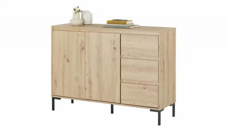 Modernes Griffloses Design Verstellbarer Boden Stabiles Metallgestell Maße Gesamtbreite: 120 cm Gesamthöhe: 87 cm Gesamttiefe: 40 cm Höhe Füße / Gestell: 14 cm Merkmale Stilrichtung: Modern Zeitlos Griffart: Gehrungsgriff Anzahl Türen: 2 Stück Anzahl Böden: 1 Stück Anzahl verstellbare Einlegeböden: 1 Stück Anzahl Schubkästen: 3 Stück Türart: Drehtüren Ausstattung Gestell: Winkel Lieferumfang nicht im Lieferumfang enthalten: Holzleim Hinweise max. Belastbarkeit je verstellbarem Einlegeboden bis ca.: 5 kg max. Belastbarkeit je Schubkasten bis ca.: 3 kg Reinigungsart & Pflegehinweise: Oberfläche mit feuchtem Baumwolltuch abwischen und mit trockenem Tuch nachwischen keine scharfen Haushaltsreiniger verwenden Seitenverkehrt montierbar: nein Material & Farbe Farbe / Dekor Korpus innen: Eiche (Nachbildung) Farbe / Dekor Einlegeböden: Eiche (Nachbildung) Farbe / Dekor sichtbare Rückwände: Eiche (Nachbildung) Farbe / Dekor Griffe: Eiche (Nachbildung) Farbe / Dekor Front: Eiche (Nachbildung) Material sichtbare Rückwand: Holzwerkstoff foliert Material Korpus: Holzwerkstoff foliert Material Front: Holzwerkstoff foliert Material Einlegeböden: Holzwerkstoff foliert Material Griffe: Holzwerkstoff foliert Material Füße / Gestell: Metall Farbe / Dekor Füße/Gestell: Schwarz Farbe / Dekor Korpus: Eiche (Nachbildung) Farbe / Dekor: Eiche (Nachbildung) Mehr zu Farbe: Herstellerfarbe: Asteiche (Nachbildung) Artikelnummer: 13349760 Lieferung ohne Dekoration