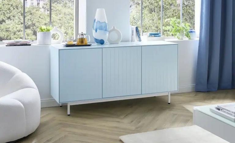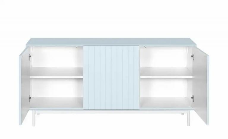 Stabiles Metallgestell Inklusive Push to Open Funktion Im stylischem Pastellton lackiert Maße Gesamtbreite: 150 cm Gesamthöhe: 75 cm Gesamttiefe: 43 cm Höhe Füße / Gestell: 15 cm Merkmale Stilrichtung: Modern Anzahl Türen: 3 Stück Anzahl Böden: 3 Stück Anzahl verstellbare Einlegeböden: 3 Stück Türart: Drehtüren Ausstattung Gestell: Füße mit Gleitern Ausstattung / Funktion: Push-to-Open-Funktion Hinweise max. Belastbarkeit je verstellbarem Einlegeboden bis ca.: 15 kg Reinigungsart & Pflegehinweise: Flüssigkeiten und Fett möglichst sofort abwischen Oberfläche mit feuchtem Baumwolltuch abwischen und mit trockenem Tuch nachwischen Seitenverkehrt montierbar: nein Material & Farbe Farbe / Dekor Korpus innen: Weiß Farbe / Dekor Einlegeböden: Weiß Farbe / Dekor Front: Hellblau Material Einlegeböden: Holzwerkstoff lackiert Material Füße / Gestell: Metall pulverbeschichtet Farbe / Dekor Füße/Gestell: Weiß Farbe / Dekor Korpus: Hellblau Farbe / Dekor: Hellblau Mehr zu Farbe: Herstellerfarbe: Kalkbleu Artikelnummer: 40341398 Lieferung ohne Dekoration