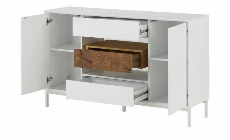 Hochwertig lackierte Oberfläche Mittlere Schub in schwebender Optik Türen und weiße Schübe mit Push to Open Funktion Türen und Schübe mit Selbsteinzug Maße Gesamtbreite: 140 cm Gesamthöhe: 85 cm Gesamttiefe: 40 cm Höhe Füße / Gestell: 15 cm Merkmale Stilrichtung: Modern Anzahl Türen: 2 Stück Anzahl Böden: 2 Stück Anzahl verstellbare Einlegeböden: 2 Stück Anzahl Schubkästen: 3 Stück Türart: Drehtüren Ausstattung Gestell: Füße mit Gleitern Ausstattung / Funktion: Push-to-Open-Funktion Selbsteinzug Hinweise max. Belastbarkeit je verstellbarem Einlegeboden bis ca.: 10 kg max. Belastbarkeit je Schubkasten bis ca.: 10 kg Reinigungsart & Pflegehinweise: Oberfläche mit feuchtem Baumwolltuch abwischen und mit trockenem Tuch nachwischen Material & Farbe Farbe / Dekor Korpus innen: Weiß matt Farbe / Dekor Einlegeböden: Weiß matt Farbe / Dekor Front: Weiß matt Wildeiche Material Korpus: Holzwerkstoff lackiert Material Front: Holzwerkstoff lackiert Holzwerkstoff furniert Material Einlegeböden: Holzwerkstoff lackiert Material Füße / Gestell: Metall pulverbeschichtet Farbe / Dekor Füße/Gestell: Weiß matt Farbe / Dekor Korpus: Weiß matt Farbe / Dekor: Weiß matt Wildeiche Artikelnummer: 40341431 Lieferung ohne Dekoration