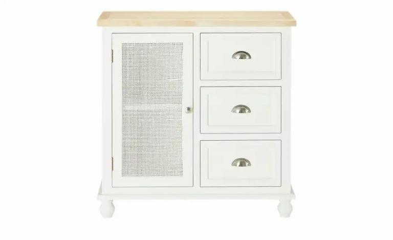 Tür mit weißem Rattangeflecht 3 Schubladen Klassisch runde Holzfüße Maße Gesamtbreite: 79,5 cm Gesamthöhe: 79,5 cm Gesamttiefe: 34 cm Merkmale Stilrichtung: klassisch Landhaus Griffart: Griffschale Mehr zu Ausführung: Türenfront mit Rattangeflecht Anzahl Türen: 1 Stück Anzahl Böden: 1 Stück Anzahl Schubkästen: 3 Stück Türanschlag: links Türart: Drehtüren Ausstattung Gestell: Füße Hinweise Reinigungsart & Pflegehinweise: Flüssigkeiten und Fett möglichst sofort abwischen keine scharfen Haushaltsreiniger verwenden Material & Farbe Farbe / Dekor Korpus innen: Weiß Farbe / Dekor Einlegeböden: Weiß Farbe / Dekor Griffe: silberfarben Farbe / Dekor Front: Weiß Material Korpus: Holzwerkstoff lackiert Material Front: Holzwerkstoff lackiert Material Einlegeböden: Holzwerkstoff lackiert Material Griffe: Metall Material Füße / Gestell: Holzwerkstoff lackiert Farbe / Dekor Füße/Gestell: Weiß Farbe / Dekor Korpus: Weiß Farbe / Dekor: Weiß Mehr zu Material: Abdeckplatte: Massivholz Mehr zu Farbe: Abdeckplatte: Kiefer, naturfarben Artikelnummer: 13347220 Lieferung ohne Dekoration