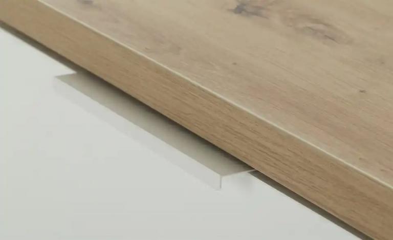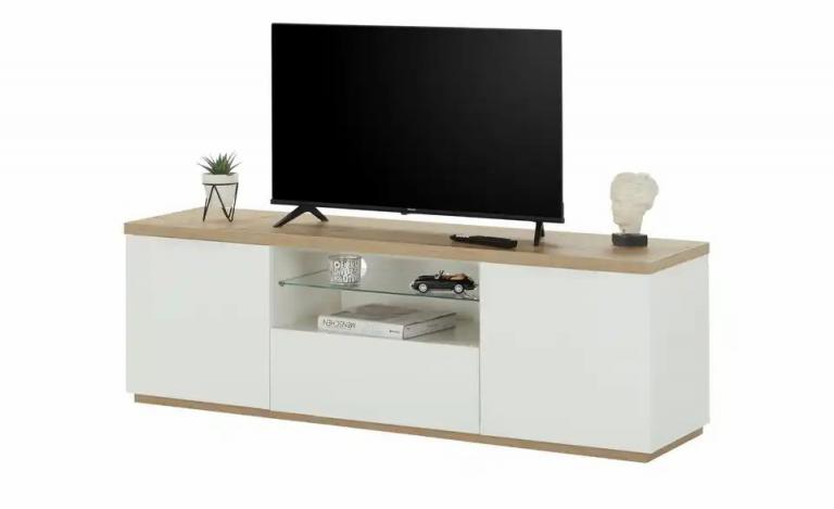 Kratzerunempfindliche Oberfläche Strahlendes Weiß mit Hochglanz Akzent in natürlicher Holzoptik Maße Gesamtbreite: 160 cm Gesamthöhe: 51 cm Gesamttiefe: 40,5 cm Merkmale Stilrichtung: Modern Zeitlos Griffart: Möbelgriff Anzahl Glasböden: 1 Stück Anzahl Türen: 2 Stück Anzahl Fächer: 2 Stück Anzahl Klappen: 1 Stück Anzahl Böden: 3 Stück Anzahl verstellbare Einlegeböden: 2 Stück Türart: Drehtüren Ausstattung Gestell: Sockel Gleiter Ausstattung / Funktion: Kabeldurchlass/Kabelkanal Anzahl Kabeldurchlässe: 3 Stück Hinweise max. Belastbarkeit je verstellbarem Einlegeboden bis ca.: 8 kg max. Belastbarkeit je festem Einlegeboden bis ca.: 2 kg Reinigungsart & Pflegehinweise: Oberfläche mit feuchtem Baumwolltuch abwischen und mit trockenem Tuch nachwischen Material & Farbe Farbe / Dekor Korpus innen: Weiß Farbe / Dekor Einlegeböden: Weiß transparent Farbe / Dekor sichtbare Rückwände: Weiß Farbe / Dekor Griffe: Weiß Farbe / Dekor Front: Weiß Hochglanz Material sichtbare Rückwand: Holzwerkstoff beschichtet Material Korpus: Holzwerkstoff beschichtet Material Front: Holzwerkstoff beschichtet Material Einlegeböden: Holzwerkstoff beschichtet Glas Material Griffe: Metall pulverbeschichtet Material Füße / Gestell: Holzwerkstoff foliert Kunststoff Farbe / Dekor Füße/Gestell: Eiche (Nachbildung) Schwarz Farbe / Dekor Korpus: Weiß Hochglanz Farbe / Dekor: Weiß Hochglanz Mehr zu Material: Oberboden: Holzwerkstoff foliert Mehr zu Farbe: Oberboden: Eiche Riviera (Nachbildung) Füße / Gestell: Eiche Riviera (Nachbildung) Artikelnummer: 40342875 Lieferung ohne Dekoration