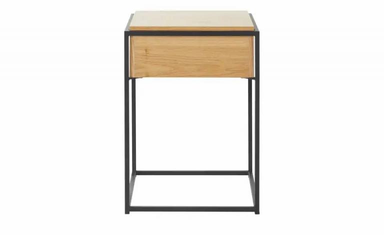 Designertisch in Markenqualität Mit praktischem Schubfach Modernes, kubistisches Design Maße Gesamtbreite: 43 cm Gesamthöhe: 60,8 cm Gesamttiefe: 43 cm Merkmale Stilrichtung: Modern Form: quadratisch Mehr zu Ausführung: Grifflose Front Ausstattung Ausstattung / Funktion: Schubladen Gestell: Kufengestell Mehr zu Ausstattung / Funktion: 1 Schublade Technische Daten max. Belastbarkeit bis ca.: 20 kg Hinweise Reinigungsart & Pflegehinweise: Flüssigkeiten und Fett möglichst sofort abwischen Material & Farbe Farbe / Dekor Gestell: Schwarz Material Tischplatte: Holzwerkstoff beschichtet Material Gestell: Metall pulverbeschichtet Farbe / Dekor: Eiche Mehr zu Material: Korpus, Schublade: Holzwerkstoff beschichtet Mehr zu Farbe: Korpus, Schublade: Eiche Dekor Artikelnummer: 40341421 Lieferung ohne Dekoration
