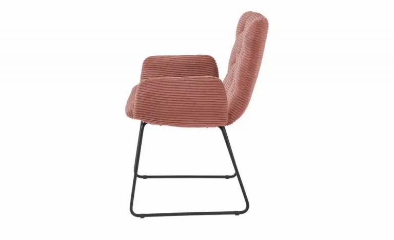 Bequeme Polsterung Angesagtes modernes Design Hochwertiger Bezug aus Cord Maße Sitzhöhe: 49 cm Gesamtbreite: 59 cm Gesamthöhe: 87 cm Gesamttiefe: 66 cm Höhe Rückenlehne: 38 cm Sitztiefe: 48 cm Merkmale Stilrichtung: Zeitlos Modern Ausstattung Ausstattung / Funktion: Armlehne Art der Polsterung: PUR Schaum Gestell: Kufengestell Polster-Unterkonstruktion: Spanplatte Mehr zu Ausstattung / Funktion: bequeme Polsterung aus PUR-Schaum und Federkern Technische Daten max. Belastbarkeit bis ca.: 120 kg Hinweise Reinigungsart & Pflegehinweise: Flüssigkeiten und Fett möglichst sofort abwischen keine scharfen Haushaltsreiniger verwenden Material & Farbe Bezug Sitz / Rückenlehne: Cordstoff Material Füße / Gestell: Metall Materialzusammensetzung Textil: 88% Polyester, 12% Polyacyl Farbe / Dekor Füße/Gestell: Schwarz matt Farbe / Dekor: Pfirsich Material Sitz / Rückenlehne: Holzwerkstoff gepolstert und bezogen Mehr zu Farbe: Herstellerfarbe: Peach Artikelnummer: 40304554 Lieferung ohne Dekoration