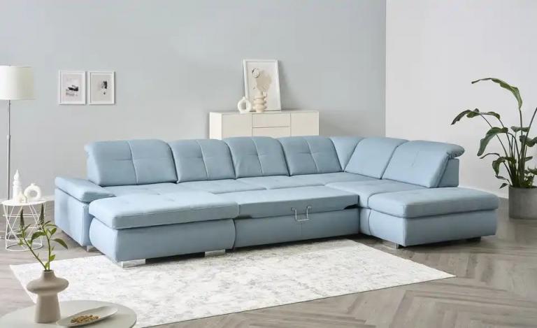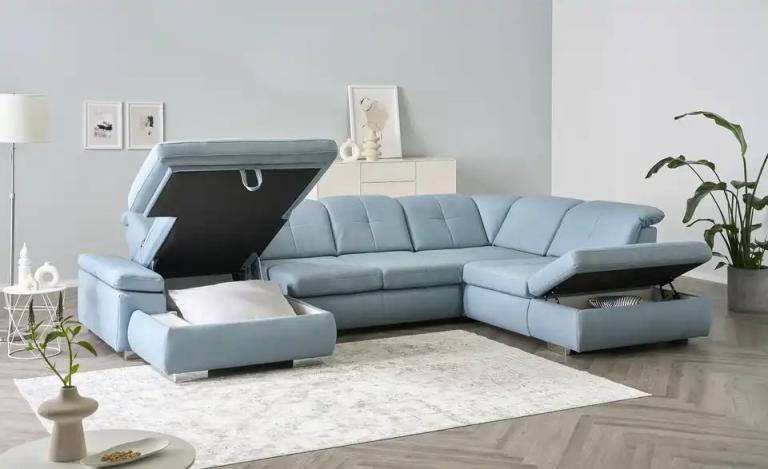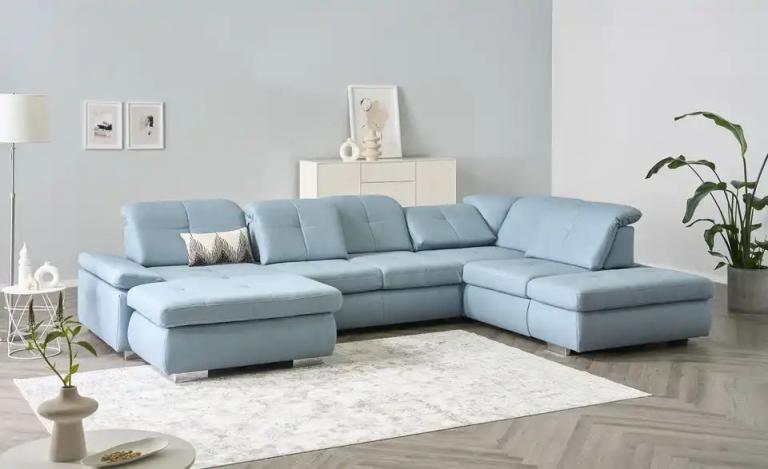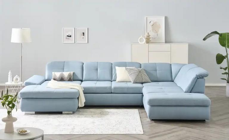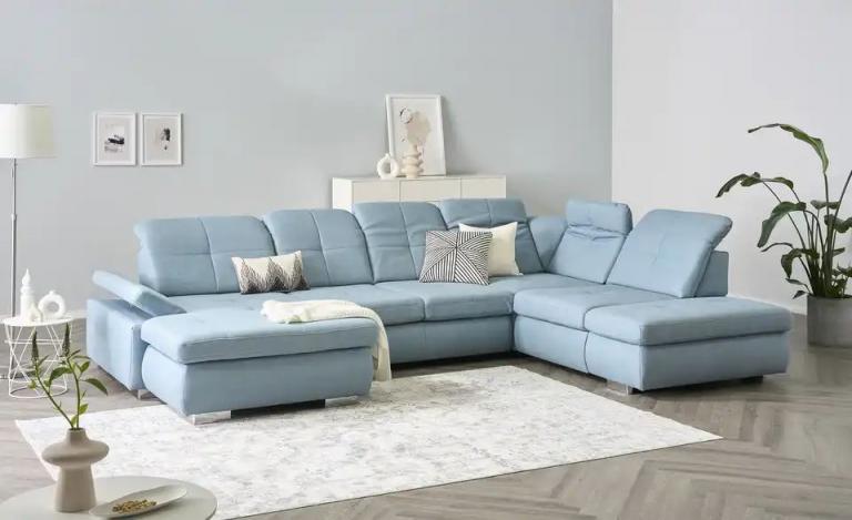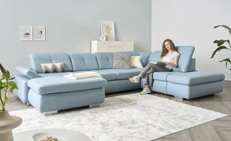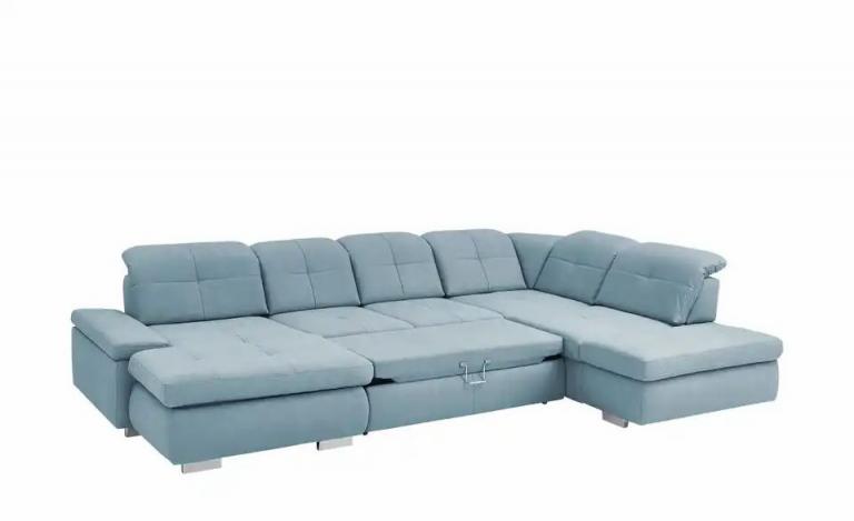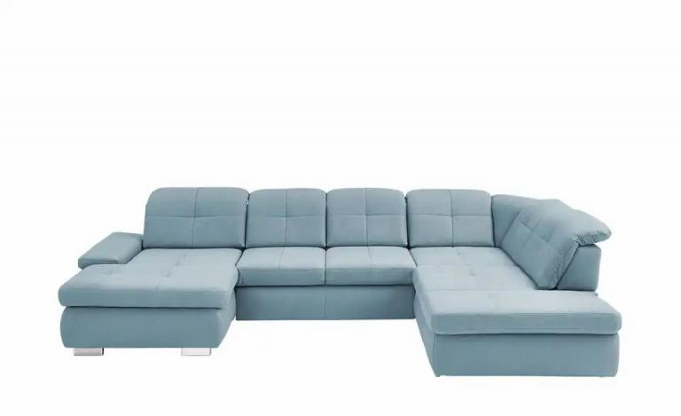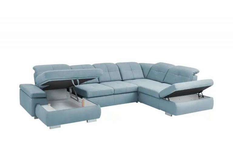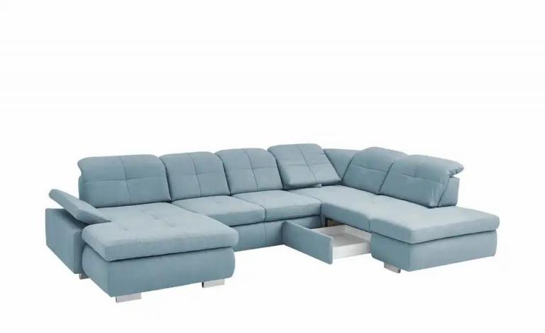 In verschiedenen Farben und Ausführungen erhältlich Mit manueller Sitztiefenverstellung Hoher Sitzkomfort durch Federkernpolsterung Bezug aus hochwertigem Mikrofaser Vollständig frei im Raum stellbar Maße Gesamtbreite: 371 cm Gesamthöhe: 100 cm Gesamttiefe: 260 cm Schenkelmaß 1: 371 cm Schenkelmaß 2: 260 cm Liegefläche Länge: 294 cm Liegefläche Breite: 145 cm Sitztiefe: 79 cm Mehr zu Maßen: Sitztiefe mit Sitzteilverstellung ca. 59 cm Merkmale Stilrichtung: Zeitlos Anzahl Sitze: 4 Ausrichtung: rechts Muster: Kein Muster Ausstattung Art der Polsterung: Federkern Polster-Unterkonstruktion: Wellenunterfederung Ausstattung / Funktion: manuelle Kopfteilverstellung Armlehnenverstellung manuell Schlaffunktion Relaxfunktion manuell Stauraum Sitztiefenverstellung manuell Füße/Gestell: eckig Funktion: Erweiterte Funktion Lieferumfang nicht im Lieferumfang enthalten: Zierkissen Material & Farbe Bezug Sitz / Rückenlehne: Mikrofaser Material Füße / Gestell: Metall Materialzusammensetzung Textil: Nutzschicht: 100% Polyester/ Grundschicht: 100% Polyester Sitz- und Rückenbezug: Nutzschicht: 100% Polyester/ Grundschicht: 100% Polyester Farbe / Dekor Füße/Gestell: silberfarben Farbe / Dekor: Hellblau Mehr zu Material: Liegefläche Mikrofaser Liegeflächen-Bezug Nutzschicht: 100% Polyester/ Grundschicht: 100% Polyester Rückseite Nutzschicht: 100% Polyester/ Grundschicht: 100% Polyester Artikelnummer: 40401278 Lieferung ohne Dekoration