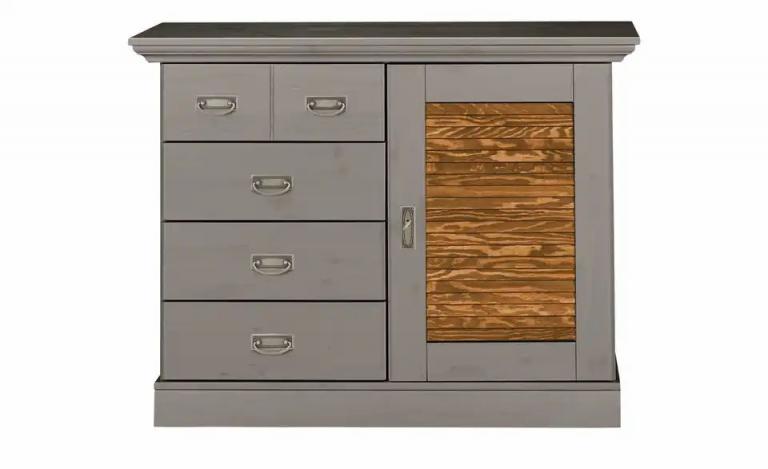Stabile Verarbeitung & pflegeleicht Schönes Landhausdesign Stauraum hinter Tür & in Schüben Maße Gesamtbreite: 118,5 cm Gesamthöhe: 90,1 cm Gesamttiefe: 48 cm Merkmale Stilrichtung: Landhaus Griffart: Hängegriff Schloss Anzahl Türen: 1 Stück Anzahl Böden: 1 Stück Anzahl verstellbare Einlegeböden: 1 Stück Anzahl Schubkästen: 4 Stück Türanschlag: rechts Türart: Drehtüren Ausstattung Gestell: Sockel Material & Farbe Farbe / Dekor Korpus innen: Grau Farbe / Dekor Einlegeböden: Grau Farbe / Dekor Griffe: silberfarben antik Farbe / Dekor Front: Grau Braun Material Korpus: Massivholz Material Front: Massivholz Material Einlegeböden: Massivholz Material Griffe: Metall Material Füße / Gestell: Massivholz Farbe / Dekor Füße/Gestell: Grau Farbe / Dekor Korpus: Grau Farbe / Dekor: Grau Braun Mehr zu Material: Korpus und Front aus Kiefer massiv Grau lackiert Lamellentüren bersteinfarben gebeizt und lackiert Artikelnummer: 40230226 Lieferung ohne Dekoration