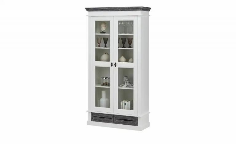 Romantischer Landhausstil in Grau-Weiß Attraktiver Vintage-Look Mit liebevollen Details Maße Gesamtbreite: 102,8 cm Gesamthöhe: 200 cm Gesamttiefe: 39,7 cm Merkmale Stilrichtung: Landhaus Griffart: Möbelknopf Lochgriff Türen mit Glaseinsatz: 2 Stück Ausführung: Vintage Look Anzahl Türen: 2 Stück Anzahl Böden: 4 Stück Anzahl verstellbare Einlegeböden: 3 Stück Anzahl Schubkästen: 2 Stück Türart: Drehtüren Ausstattung Gestell: Sockel Ausstattung / Funktion: Türdämpfer Mehr zu Ausstattung / Funktion: Schubkästen auf kugelgelagerten Laufschienen Lieferumfang nicht im Lieferumfang enthalten: LED-Beleuchtung (separat erhältlich) Material & Farbe Material Kranz: Massivholz Farbe / Dekor Korpus innen: Weiß matt Farbe / Dekor Einlegeböden: Weiß matt Farbe / Dekor Kranz: Fichte Grau antik Farbe / Dekor sichtbare Rückwände: Weiß matt Farbe / Dekor Griffe: Grau antik Farbe / Dekor Front: Weiß matt Material sichtbare Rückwand: Holzwerkstoff lackiert Material Korpus: Holzwerkstoff lackiert Massivholz Material Front: Holzwerkstoff lackiert Glas Material Griffe: Metall Material Füße / Gestell: Holzwerkstoff lackiert Farbe / Dekor Füße/Gestell: Weiß matt Farbe / Dekor Korpus: Weiß matt Farbe / Dekor: Fichte Grau Weiß Mehr zu Material: Korpus und Front aus Holzwerkstoff lackiert in Weiß matt Oberplatte und Korbfronten aus Fichte massiv Grau antik gebürstet und gekälkt Artikelnummer: 12236385 Lieferung ohne Dekoration