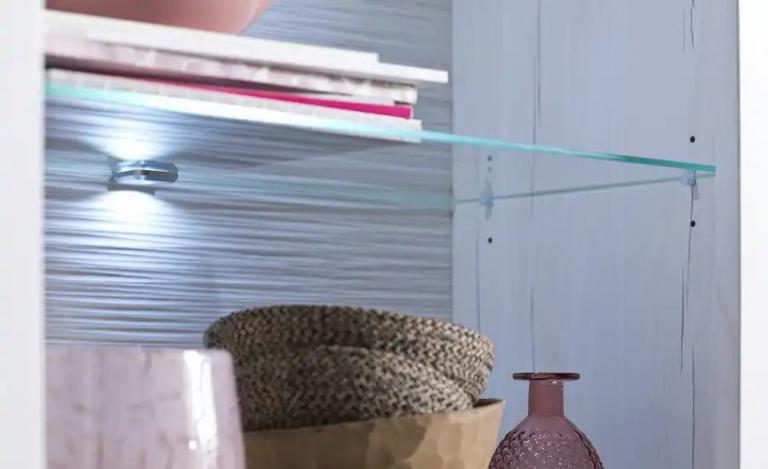 Hochwertige, stabile Verarbeitung Schönes Weiß mit Akzenten in Holzoptik Vitrinenfächer für Ihre Lieblingsdeko Maße Gesamtbreite: 73 cm Gesamthöhe: 210 cm Gesamttiefe: 40 cm Mehr zu Maßen: Holzeinlegeböden ca. 1,6 cm stark Glaseinlegeböden: ca. 0,5 cm stark Höhe Füße / Gestell: 1 cm Merkmale Stilrichtung: Landhaus Griffart: Möbelgriff Türen mit Glaseinsatz: 1 Stück Anzahl Glasböden: 3 Stück Anzahl Türen: 2 Stück Anzahl Böden: 4 Stück Anzahl verstellbare Einlegeböden: 4 Stück Türanschlag: links Türart: Drehtüren Ausstattung Gestell: Gleiter Ausstattung / Funktion: Beleuchtung Leuchtmittelart: LED Technische Daten Austauschbarkeit der Lichtquelle: Bei diesem Produkt ist das Austauschen der Lichtquelle durch einen Fachmann möglich. Lieferumfang Lieferumfang / mitgeliefertes Zubehör: 3er Set LED Glasbodenbeleuchtung inkl. Trafo und Zuleitung 1er Set LED Power Spot inkl. Trafo und Zuleitung Material & Farbe Material Kranz: Holzwerkstoff tiefgezogen Farbe / Dekor Korpus innen: Weiß Farbe / Dekor Einlegeböden: Weiß Farbe / Dekor Kranz: Eiche (Nachbildung) Farbe / Dekor sichtbare Rückwände: Pinie (Nachbildung) Farbe / Dekor Griffe: silberfarben Farbe / Dekor Front: Pinie (Nachbildung) Material sichtbare Rückwand: Holzwerkstoff beschichtet Material Korpus: Holzwerkstoff beschichtet Holzwerkstoff tiefgezogen Material Front: Holzwerkstoff tiefgezogen Glas Material Einlegeböden: Glas Holzwerkstoff beschichtet Material Griffe: Metall Material Füße / Gestell: Kunststoff Farbe / Dekor Füße/Gestell: Schwarz Farbe / Dekor Korpus: Pinie (Nachbildung) Eiche (Nachbildung) Farbe / Dekor: Pinie (Nachbildung) Eiche (Nachbildung) Mehr zu Material: Front aus MFD (Mitteldichte Faserplatte) in Pinie Aurelio tiefzieh (Nachbildung) Korpus aus DBS (Direktbeschichtete Spanplatte) in Pinie Aurelio Melamin (Nachbildung) Kranz aus MDF (Mitteldichte Faserplatte) in Grandson Oak tiefzieh (Nachbildung) sichtbare Rückwand in Pinie Aurelio 3D-Optik (Nachbildung) Frontverglasung aus ESG (Einscheibensicherheitsglas) Artikelnummer: 12236135 Lieferung ohne Dekoration