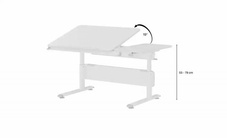 Leichte Höhenverstellung mit Kurbel Große Tischplatte bis 19° neigbar Zertifizierte, stabile Qualität Vordere Tischkante mit Lineal Seitlicher Haken für Schultasche Maße Bemasstes Produktbild ansehen Gesamtbreite: 130 cm Gesamthöhe: 53 cm Gesamttiefe: 70 cm Höhenverstellbar: 53.0 cm 79.0 cm 53 – 79 cm Maße Tisch (LxB): 90 x 70 cm + 37,5 x 70 cm Höhe Tischunterkante: 51,8 cm Stärke Tischplatte: 2,2 cm Merkmale Stilrichtung: Modern Form: rechteckig eckig Ausführung Tischkante: gerade Tischkante Allgemeine Prüf- und Gütesiegel: Der Blaue Engel GS – Geprüfte Sicherheit Ausstattung Ausstattung / Funktion: manuell höhenverstellbar Gestell: Kufengestell Mehr zu Ausstattung / Funktion: Schreibtischplatte geteilt, große Platte schrägstellbar bis 19° kleine feststehende Tischplatte links oder rechts montierbar Streifenbürste zwischen den Tischplatten als Klemmschutz mit Lineal 60 cm in grau, Ablageschale und Taschenhaken Technische Daten max. Belastbarkeit bis ca.: 100 Hinweise Garantie: 5 Jahre Nachkaufgarantie von Paidi 5 Jahre Produktgarantie von Paidi Reinigungsart & Pflegehinweise: Oberfläche mit feuchtem Baumwolltuch abwischen und mit trockenem Tuch nachwischen Material & Farbe Farbe / Dekor Gestell: Weiß Material Tischplatte: Holzwerkstoff beschichtet Material Gestell: Metall pulverbeschichtet Farbe / Dekor: Eiche (Nachbildung) Weiß Mehr zu Material: Material Applikationen: Kunststoff, silberfarbig Material Streifenbürste: Kunststoff, weiß Artikelnummer: 11352051 Lieferung ohne Dekoration