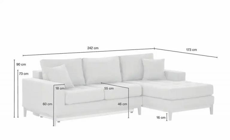 Leicht zum Gästebett auszuziehen Praktischer Bettkasten unter Sitzfläche Inkl. weicher Rücken- und Zierkissen Flexibel in den Wohnraum zu stellen Gemütlich wirkendes Scandi-Design Maße Bemasstes Produktbild ansehen Gesamtbreite: 242 cm Gesamthöhe: 90 cm Gesamttiefe: 173 cm Schenkelmaß 1: 242 cm Schenkelmaß 2: 173 cm Liegefläche Länge: 205 cm Liegefläche Breite: 130 cm Sitztiefe: 55 cm Mehr zu Maßen: Spezielle Maße: Rückenkissen ca. 68x45x12 cm Spezielle Maße: Zierkissen ca. 43×43 cm Sitzhöhe: 46 Höhe Rückenlehne: 40 cm Höhe Füße / Gestell: 15,5 cm Höhe Armlehne: 46 cm Breite Armlehne: 18 cm Höhe Armlehne rechts: 46 cm Höhe Armlehne links: 46 cm Breite Armlehne rechts: 18 cm Breite Armlehne links: 18 cm Bodenfreiheit: 15,5 cm Merkmale Stilrichtung: Skandi Anzahl Sitze: 3 Ausrichtung: rechts Motiv: kein Motiv Muster: uni max. Belastbarkeit der Polsterung: 120 kg Ausstattung Art der Polsterung: Wellenunterfederung Polster-Unterkonstruktion: Spanplatte Ausstattung / Funktion: Bettkasten Schlaffunktion Füße/Gestell: Füße Funktion: Erweiterte Funktion Lieferumfang Lieferumfang / mitgeliefertes Zubehör: 3 Rückenkissen, 2 Zierkissen mit Knopfheftung Hinweise Reinigungsart & Pflegehinweise: Flüssigkeiten und Fett möglichst sofort abwischen Material & Farbe Material Korpus: Holzwerkstoff gepolstert und bezogen Bezug Sitz / Rückenlehne: Flachgewebe Material Füße / Gestell: Massivholz Materialzusammensetzung Textil: 100% Polyester Sitz- und Rückenbezug: 100% Polyester Farbe / Dekor Füße/Gestell: Buche Farbe / Dekor: Mintgrün Mehr zu Material: Zierkissenbezug 100% Polyester Artikelnummer: 22400790 Lieferung ohne Dekoration