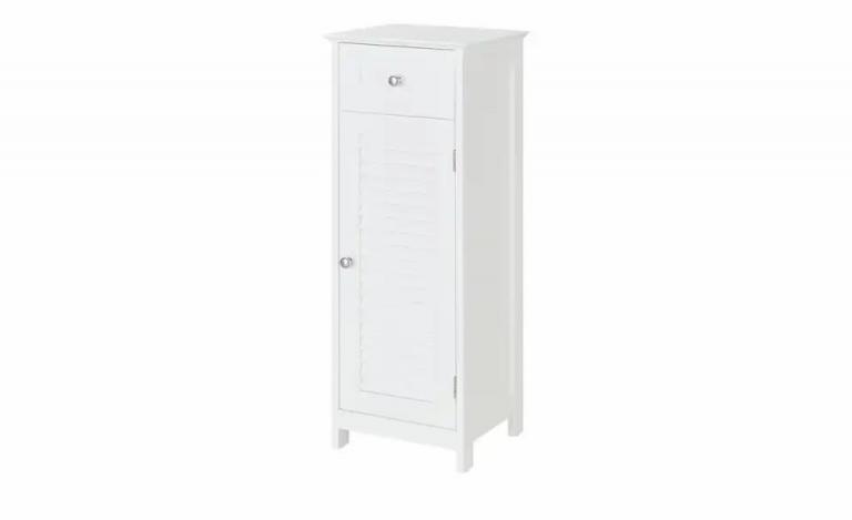 Maritime Landhausnote in mattem Weiß Tür mit auffälliger Lamellenoptik Eine geräumige Schublade Zwei Fächer innen mit verstellbarem Boden Viel Platz für Ihre Pflegeartikel & Handtücher Maße Gesamtbreite: 32 cm Gesamthöhe: 87 cm Gesamttiefe: 30 cm Merkmale Stilrichtung: Landhaus Griffart: Möbelknopf Mehr zu Ausführung: stehend Anzahl Türen: 1 Stück Anzahl Böden: 1 Stück Anzahl verstellbare Einlegeböden: 1 Stück Anzahl Schubkästen: 1 Stück Türanschlag: rechts Türart: Drehtüren Ausstattung Gestell: Füße Hinweise Reinigungsart & Pflegehinweise: Oberfläche mit feuchtem Baumwolltuch abwischen und mit trockenem Tuch nachwischen Material & Farbe Farbe / Dekor Korpus innen: Weiß Farbe / Dekor Einlegeböden: Weiß Farbe / Dekor Griffe: silberfarben Farbe / Dekor Front: matt Weiß Material sichtbare Rückwand: Holzwerkstoff lackiert Material Korpus: Holzwerkstoff lackiert Material Front: Holzwerkstoff lackiert Material Einlegeböden: Holzwerkstoff lackiert Material Griffe: Metall Material Füße / Gestell: Holzwerkstoff lackiert Farbe / Dekor Füße/Gestell: Weiß matt Farbe / Dekor Korpus: Weiß Farbe / Dekor: Weiß Mehr zu Farbe: Weiß Artikelnummer: 10069383 Lieferung ohne Dekoration