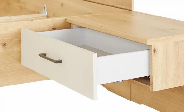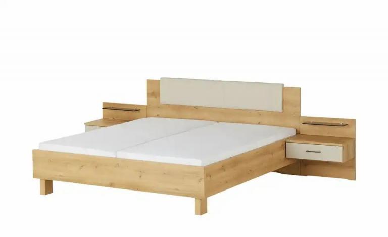 Gesamtbreite: 309 cm Gesamtlänge: 215 cm Gesamthöhe: 91 cm Liegefläche Breite: 180 cm Bettseitenhöhe: 43 cm Mehr zu Maßen: Nachtkommode (BxHxT) 44/38/38 cm Paneel (BxH) 60/20 cm Kopfteilhöhe ca. 91 cm Liegefläche Länge: 200 cm Merkmale Stilrichtung: Zeitlos Modern Mehr zu Ausführung: Kopfteil Holzkopfteil mit Winkelpolster in Kunstleder Champagner Allgemeine Prüf- und Gütesiegel: TÜV Rheinland Deutsche Gütegemeinschaft Möbel – Goldenes M Ausstattung Füße/Gestell: eckig Lieferumfang Lieferumfang / mitgeliefertes Zubehör: 2 Nachtkonsolen 2 Nachtkonsolen-Paneele mit Rauchglasböden nicht im Lieferumfang enthalten: Lattenrahmen und Matratzen Material & Farbe Farbe / Dekor Füße: Eiche Bianco (Nachbildung) Material Gestell: Holzwerkstoff foliert Material Bezug: Kunstleder Materialzusammensetzung Textil: Winkelpolster: Kunstleder (100% Polyurethan) Farbe / Dekor: Eiche Bianco (Nachbildung) Champagner Material Füße: Holzwerkstoff foliert Mehr zu Material: Kopfteil Holzwerkstoff Foliert, Holzwerkstoff Gepolstert Stoffbezogen Mehr zu Farbe: Kopfteil Eiche_Bianco Nachbildung Artikelnummer: 12108631 Lieferung ohne Dekoration