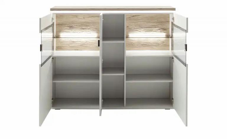 Inklusive LED-Oberbodenbeleuchtung Vielseitiger Stauraum Natürlich wirkende Eichenoptik Maße Gesamtbreite: 150 cm Gesamthöhe: 124 cm Gesamttiefe: 37 cm Merkmale Stilrichtung: Modern Griffart: Möbelgriff Türen mit Glaseinsatz: 2 Stück Anzahl Glasböden: 2 Stück Anzahl Türen: 3 Stück Anzahl Böden: 8 Stück Anzahl verstellbare Einlegeböden: 2 Stück Türart: Drehtüren Ausstattung Gestell: Gleiter Ausstattung / Funktion: Beleuchtung Leuchtmittelart: LED Technische Daten Austauschbarkeit der Lichtquelle: Bei diesem Produkt ist das Austauschen der Lichtquelle durch einen Fachmann möglich. Lieferumfang Lieferumfang / mitgeliefertes Zubehör: inkl. LED-Oberbodenbeleuchtung nicht im Lieferumfang enthalten: LED-Rückwandbeleuchtung (separat erhältlich) Material & Farbe Farbe / Dekor Korpus innen: Hellgrau Farbe / Dekor Einlegeböden: Hellgrau Farbe / Dekor sichtbare Rückwände: Eiche (Nachbildung) Farbe / Dekor Griffe: Anthrazit Farbe / Dekor Front: Hellgrau Material sichtbare Rückwand: Holzwerkstoff beschichtet Material Korpus: Holzwerkstoff beschichtet Glas Material Front: Holzwerkstoff tiefgezogen Glas Material Einlegeböden: Glas Holzwerkstoff beschichtet Material Griffe: Metall Material Füße / Gestell: Kunststoff Farbe / Dekor Füße/Gestell: Schwarz Farbe / Dekor Korpus: Hellgrau Eiche (Nachbildung) Farbe / Dekor: Hellgrau Eiche (Nachbildung) Mehr zu Material: Korpus aus Holzwerkstoff melaminbeschichtet in Modern White (Hellgrau) Oberboden aus Holzwerkstoff melaminbeschichtet in Viking Oak (Eiche Nachbildung) Front aus Holzwerkstoff tiefgezogen in Modern White (Hellgrau) Sichtbare Rückwand aus Holzwerkstoff in 3D Viking Oak sandgestrahlt (Eiche Nachbildung) Front- und Seitenverglasung sowie Glasböden in Parsol Grau Artikelnummer: 40201779 Lieferung ohne Dekoration