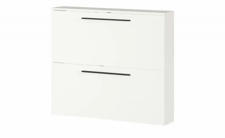 Moderner Hängeschuhschrank Schwerelos anmutendes Design Mit 19 cm Tiefe ideal für schmale Flure Maße Gesamtbreite: 100 cm Gesamthöhe: 85 cm Gesamttiefe: 19 cm Merkmale Stilrichtung: Modern Griffart: Möbelgriffleiste Platz für ca.: 8 Paar Schuhe Mehr zu Ausführung: Stehend oder Hängend montierbar Anzahl Klappen: 2 Stück Anzahl Schuhwalzen: 2 Stück Allgemeine Prüf- und Gütesiegel: Made in Germany Ausstattung Gestell: Gleiter Mehr zu Ausstattung / Funktion: Inklusive Gleiter zum Stehen Lieferumfang Lieferumfang / mitgeliefertes Zubehör: Fußgleiter Hinweise Reinigungsart & Pflegehinweise: Flüssigkeiten und Fett möglichst sofort abwischen Material & Farbe Farbe / Dekor Korpus innen: Weiß Farbe / Dekor Griffe: Schwarz Farbe / Dekor Front: Weiß Material Korpus: Holzwerkstoff beschichtet Material Front: Holzwerkstoff beschichtet Material Griffe: Metall Material Füße / Gestell: Kunststoff Farbe / Dekor Füße/Gestell: Schwarz Farbe / Dekor Korpus: Weiß Farbe / Dekor: Weiß Mehr zu Material: Korpus und Front: Spanplatte melaminbeschichtet Schuhkörbe: Metall Artikelnummer: 12362736 Lieferung ohne Dekoration