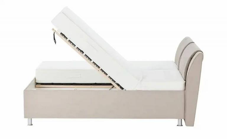 Inklusive 5-Zonen-Tonnentaschenfederkernmatratzen Inklusive 2 verstellbarer Lattenrahmen Zusätzlicher Stauraum durch innenliegenden Bettkasten Kopfteil mit Latz pro Bettseite Maße Gesamtbreite: 172 cm Gesamtlänge: 225 cm Gesamthöhe: 98 cm Liegefläche Breite: 160 cm Liegefläche (B x L): 160×200 cm Mehr zu Maßen: Kernhöhe 17,5 cm Höhe Matratze: 21 cm Liegefläche Länge: 200 cm Höhe Füße: 10 cm Merkmale Stilrichtung: klassisch Mehr zu Ausführung: Kopfteil mit Latz Härtegrad der Matratze(n): H2 Liegeempfinden der Matratze: mittel Ausstattung Füße/Gestell: Zylinder Ausstattung / Funktion: innen liegender Bettkasten manuelle Kopfteilverstellung Mehr zu Ausstattung / Funktion: 5 Liegezonen Matratzenbezug abnehmbar Matratzenbezug teilbar & einzeln waschbar Lattenrahmen mit Gasdruckfeder für ein leichtes Öffnen des Bettkastens Lieferumfang Lieferumfang / mitgeliefertes Zubehör: 2 Lattenroste 2 Matratzen Hinweise Reinigungsart & Pflegehinweise: Bezüge sind abnehmbar und leicht zu reinigen Material & Farbe Farbe / Dekor Füße: Aluminiumgrau Material Gestell: Holzwerkstoff gepolstert und bezogen Matratzenkern: Tonnentaschenfederkern Material Bezug: Webstoff Topperkern: Schaumstoffkern Materialzusammensetzung Textil: Matratzenbezug: Drell (100% Polyester) Kopfteil & Bettgestell: Flachgewebe (92% Polyester; 8% Nylon) Kopfteillatz:Grobgewebe (100% Polyester) Farbe / Dekor: Beige Grau Material Füße: Kunststoff Mehr zu Material: Kopfteil Holzwerkstoff Gepolstert Stoffbezogen Artikelnummer: 14121671 Lieferung ohne Dekoration