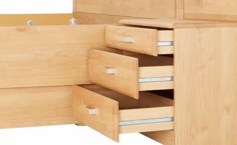 Gesamtbreite: 312 cm Gesamtlänge: 207 cm Gesamthöhe: 96 cm Liegefläche Breite: 180 cm Bettseitenhöhe: 43 cm Liegefläche (B x L): 180×200 cm Mehr zu Maßen: Bettkasten (BxHxT) ca. 140x15x61cm Einlegetiefe Lattenrost max. 18,0 cm Liegefläche Länge: 200 cm Merkmale Stilrichtung: Landhaus klassisch Mehr zu Ausführung: Fräsungen in Kopf- und Fußteil Ausführung: mit Bettschubkästen, Aufsatzpaneelen und Beleuchtung Allgemeine Prüf- und Gütesiegel: Made in Germany TÜV Rheinland Ausstattung Leuchtmittelart: LED Füße/Gestell: eckig Ausstattung / Funktion: 2 Bettschubkästen Nachtkommode 3 Schubkästen Lattenrost-Einlegetiefe variabel Mehr zu Ausstattung / Funktion: Einlegetiefe für den Lattenrost 4-fach höhenverstellbar Technische Daten Austauschbarkeit der Lichtquelle: Bei diesem Produkt ist das Austauschen der Lichtquelle durch einen Fachmann möglich. Lieferumfang Lieferumfang / mitgeliefertes Zubehör: inkl. Beleuchtung nicht im Lieferumfang enthalten: Lattenrost und Matratzen Material & Farbe Material Gestell: Holzwerkstoff foliert Farbe / Dekor: Erle Erle (Nachbildung) Material Füße: Massivholz Mehr zu Material: Kopfteil, Fußteil und Füße: Massivholz Fußteil Massivholz Kopfteil Massivholz Seitenteile: Holzwerkstoff mit Dekorfolie Artikelnummer: 12108054 Lieferung ohne Dekoration