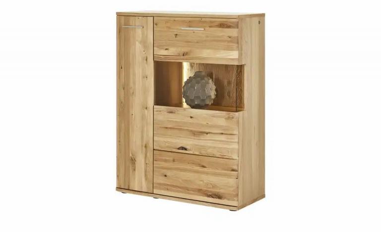 Prägnant gemaserte Asteiche Bianco Front aus stabilem Massivholz Korpus hochwertig furniert Vitrinenfach mit Parsolglasakzent Stauraum in 7 Fächern hinter Türen Maße Gesamtbreite: 90 cm Gesamthöhe: 122 cm Gesamttiefe: 37 cm Mehr zu Maßen: Holzeinlegeböden ca. 1,6 cm stark Höhe Füße / Gestell: 1,2 cm Merkmale Stilrichtung: Zeitlos Griffart: Möbelgriff Türen mit Glaseinsatz: 1 Stück Mehr zu Ausführung: Front mit durchgehender Lamelle Ausführung: Rechts Anzahl Türen: 2 Anzahl Böden: 6 Stück Anzahl verstellbare Einlegeböden: 2 Türanschlag: rechts Türart: Drehtüren Ausstattung Gestell: Gleiter Ausstattung / Funktion: Türdämpfer Lieferumfang nicht im Lieferumfang enthalten: LED Beleuchtung (separat erhältlich) Material & Farbe Farbe / Dekor Korpus innen: Eiche Bianco (Nachbildung) Farbe / Dekor Einlegeböden: Eiche Bianco (Nachbildung) Farbe / Dekor sichtbare Rückwände: Eiche bianco geölt Farbe / Dekor Griffe: silberfarben Farbe / Dekor Front: Eiche bianco geölt Material sichtbare Rückwand: Massivholz Material Korpus: Holzwerkstoff furniert Glas Material Front: Massivholz Glas Material Einlegeböden: Holzwerkstoff beschichtet Material Griffe: Metall Material Füße / Gestell: Kunststoff Farbe / Dekor Füße/Gestell: Schwarz Farbe / Dekor Korpus: Eiche bianco geölt Farbe / Dekor: Eiche bianco Mehr zu Material: Front aus Massivholz in Asteiche Bianco geölt Korpus aus Holzwerkstoff furniert in Eiche Bianco geölt / innen Eiche Bianco (Nachbildung) Glaseinsätze: Parsol Braun Artikelnummer: 12234899 Lieferung ohne Dekoration