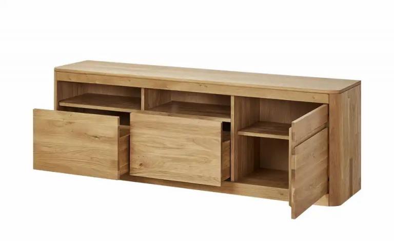Stabile, massive Wildeiche Bianco Oberfläche mit Öl versiegelt Auffällige, rustikal-natürliche Maserung Zwei Gerätefächer mit Kabeldurchlass Stauraum hinter Tür und in zwei Schubladen Maße Gesamtbreite: 170 cm Gesamthöhe: 60 cm Gesamttiefe: 41 cm Merkmale Stilrichtung: Zeitlos Griffart: Griffmulde Anzahl Türen: 1 Stück Anzahl Fächer: 2 Stück Anzahl Böden: 1 Stück Anzahl Schubkästen: 2 Stück Türanschlag: rechts Türart: Drehtüren Ausstattung Gestell: Gleiter Ausstattung / Funktion: Türdämpfer Schubkastendämpfer Kabeldurchlass/Kabelkanal Anzahl Kabeldurchlässe: 1 Stück Material & Farbe Farbe / Dekor Korpus innen: Wildeiche Farbe / Dekor sichtbare Rückwände: Wildeiche Farbe / Dekor Griffe: Wildeiche Farbe / Dekor Front: Wildeiche Material sichtbare Rückwand: Holzwerkstoff furniert Material Korpus: Massivholz Material Front: Massivholz Material Griffe: Massivholz Material Füße / Gestell: Kunststoff Farbe / Dekor Füße/Gestell: Wildeiche Farbe / Dekor Korpus: Wildeiche Farbe / Dekor: Wildeiche Mehr zu Material: Korpus und Front aus Massivholz in Wildeiche Bianco geölt Artikelnummer: 12205683 Lieferung ohne Dekoration