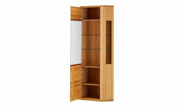 Nutzt Ecken optimal aus Drei Vitrinenfächer für Geschirr Stauraum in drei weiteren Fächern Front aus stabilem Massivholz Korpus hochwertig furniert Maße Gesamthöhe: 209 cm Schenkelmaß 1: 70 cm Schenkelmaß 2: 70 cm Mehr zu Maßen: Einlegeböden (Holz) ca. 1,6 cm stark Einlegeböden (Glas) ca. 0,8 cm stark Merkmale Stilrichtung: Zeitlos Griffart: Möbelgriff Türen mit Glaseinsatz: 1 Stück Anzahl Glasböden: 2 Stück Mehr zu Ausführung: Tür und Seiten mit Glaseinsatz mit eingefrästem Griff Ausführung: Front mit durchgehender Lamelle Anzahl Türen: 1 Stück Anzahl Böden: 5 Stück Anzahl verstellbare Einlegeböden: 3 Stück Türanschlag: links Türart: Drehtüren Ausstattung Gestell: Sockel Mehr zu Ausstattung / Funktion: Glasböden je max. belastbar bis 5 kg Lieferumfang nicht im Lieferumfang enthalten: LED-Beleuchtung (separat erhältlich) Material & Farbe Farbe / Dekor Korpus innen: Kernbuche (Nachbildung) Farbe / Dekor Einlegeböden: Kernbuche (Nachbildung) Farbe / Dekor sichtbare Rückwände: Kernbuche (Nachbildung) Farbe / Dekor Griffe: Silbergrau Farbe / Dekor Front: Kernbuche geölt Material sichtbare Rückwand: Holzwerkstoff foliert Material Korpus: Holzwerkstoff furniert Glas Material Front: Massivholz Glas Material Einlegeböden: Glas Holzwerkstoff foliert Material Griffe: Metall Material Füße / Gestell: Holzwerkstoff furniert Farbe / Dekor Korpus: Kernbuche geölt Farbe / Dekor: Kernbuche Mehr zu Farbe: Frontglas in Parsol Braun Glaseinlegeböden in Klarglas Artikelnummer: 11236502 Lieferung ohne Dekoration